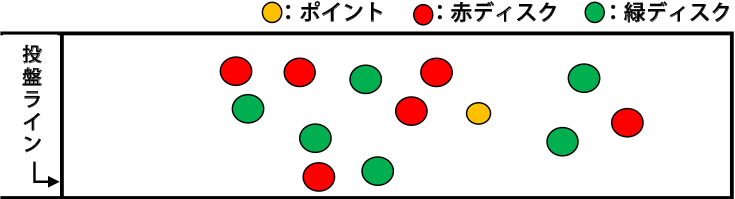 ポイントに一番近い相手のディスクよりも近い枚数が、そのチームの得点となります。