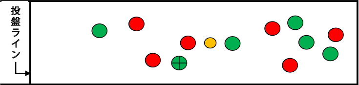 - [パターン2]の事例では、ポイントに接している赤と緑の2枚は等距離なので採点上は2枚を外して、次に近い下方の緑[